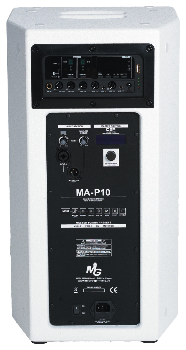MA-P10DW Self-Powered 10″ 2-Way-Loudspeaker w. 2 Channel Wireless Receiver (white) 518-542 MHz